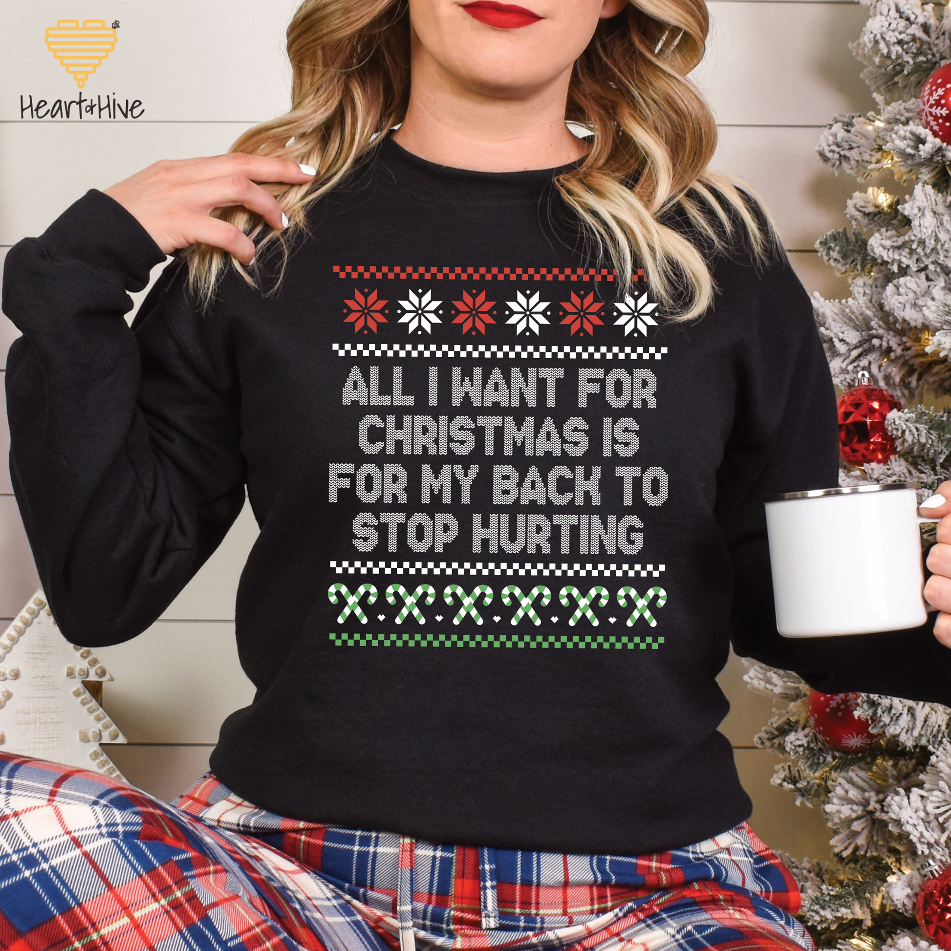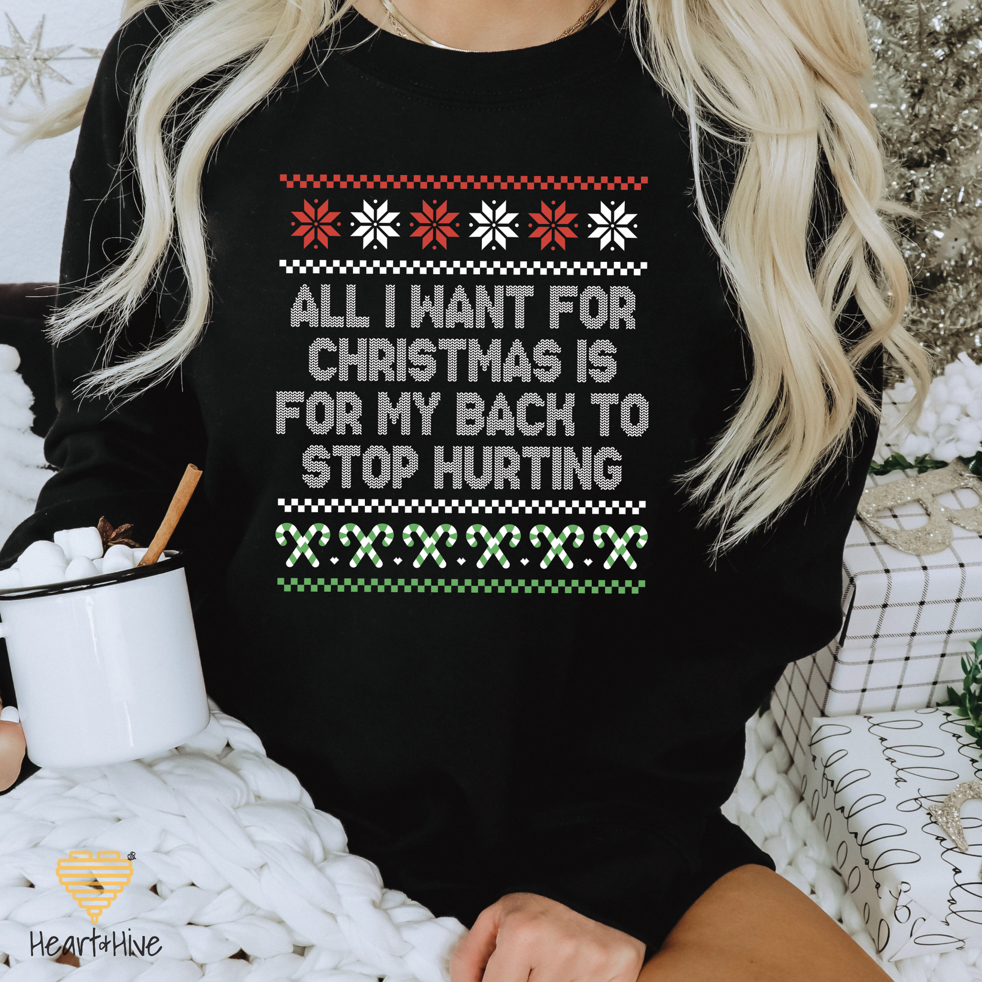 All I Want For Christmas Is My Back To Stop Hurting Faux Ugly Christmas Sweater // Sweatshirt // BLACK